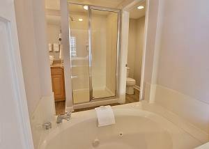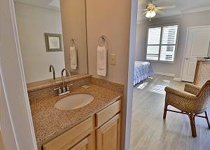 The MASTER SUITE features luxurious KING bed and private bath. There’s plenty of space to store your beachwear in the spacious closets. You’ll notice the large 40” flat screen TV that makes for great viewing when you’re relaxing after an activity filled day in Panama City Beach. You can step out onto the balcony from the MASTER SUITE which is really nice.