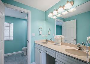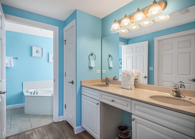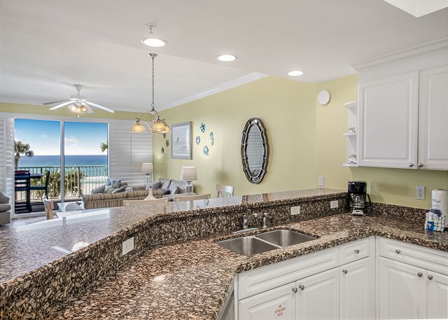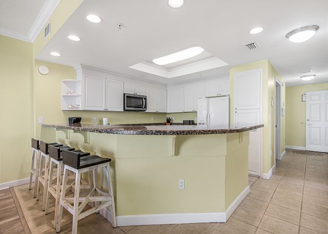 The large, modern kitchen is fully equipped, making it easy to prepare meals and dine in, giving you the flexibility to save money for more vacation fun. The open-concept layout creates a welcoming atmosphere for gathering, whether you’re sharing meals or relaxing together after a day in the sun.
