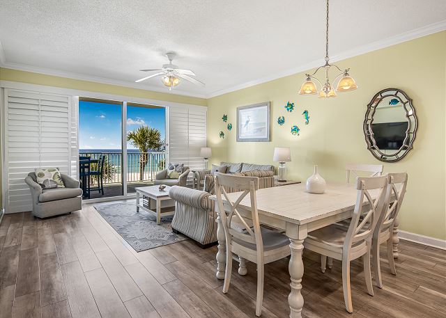 This spacious second floor four-bedroom, three-bathroom condo with a bonus room is the perfect coastal retreat for families and groups, comfortably accommodating up to twelve guests. Thoughtfully designed for both comfort and convenience, this beautifully appointed unit provides everything you need for a relaxing Gulf-front getaway.