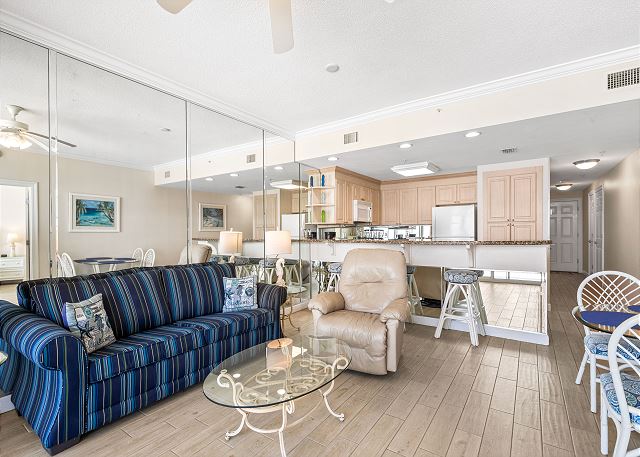 Beyond your luxury abode are water sports galore! Spend days kayaking, surfing, or jet skiing, or walk to the pier for an afternoon of fishing. Relax with a book on the resort sun deck, or plan family-friendly excursions at nearby Gulf World Marine park or Shipwreck Island Water Park.