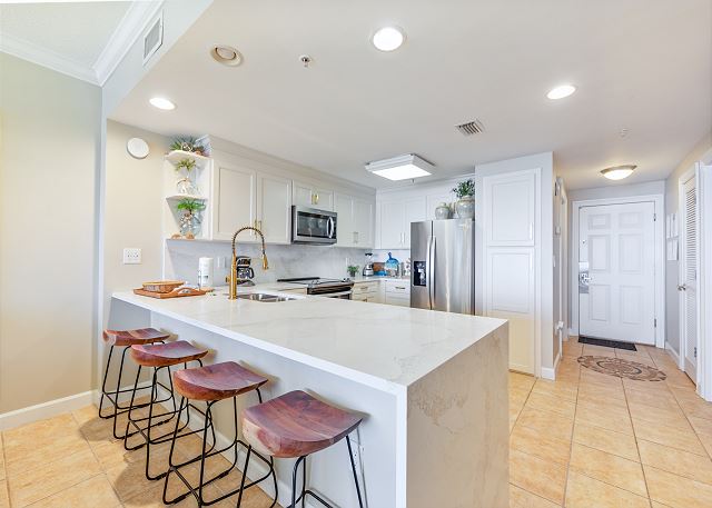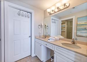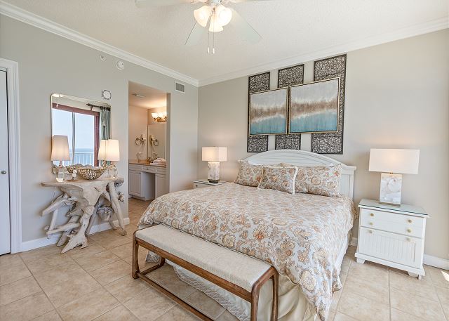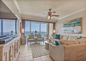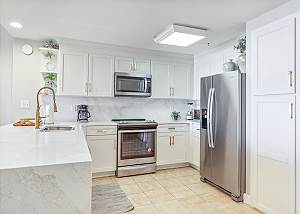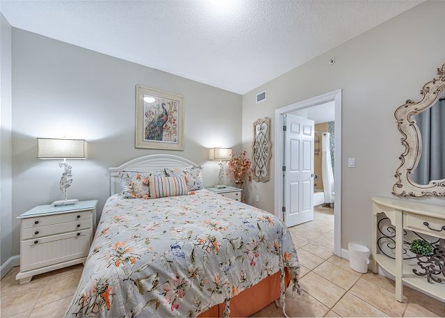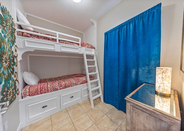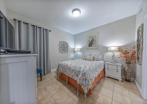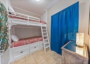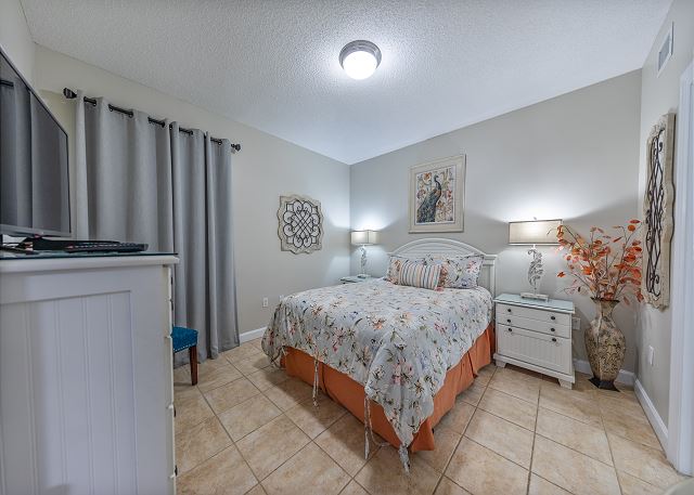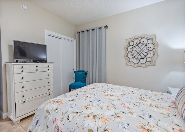 The master bedroom has a king size bed and a spectacular view of the gulf with access to the balcony and cable tv. Very few other condos have floor to ceiling windows like these. The view is spectacular. The 2nd bedroom has a queen size bed and cable tv. The 3rd bedroom has a twin size bunkbed. The living room has balcony ocean view with balcony access and a pull out couch. The kitchen is fully stocked. There is a washer and dryer in unit.