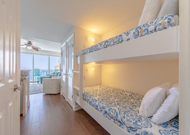 Stunning views of the gulf from this quaint condo! Cooled by central air conditioning and ceiling fans, this condo's ready to be your personal base for relaxation. The main bedroom is right by the front door, so you can sink into bed after your long flight to the Sunshine State. The bedroom includes a private entrance to the bathroom, which features a shower/tub combination. The hallway bunk beds (each with their own individual reading light) are ideal for younger guests or adults. Also a bonus sleeper sofa in the living room can sleep up to 2 adults. Cook up breakfast in the full kitchen with views of the gulf! In addition to the beach, guests have access to a beautiful shared outdoor pool and hot tub for the perfect beach experience.