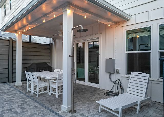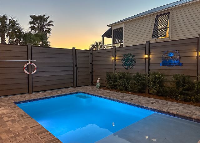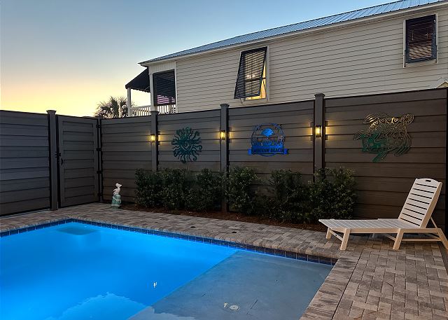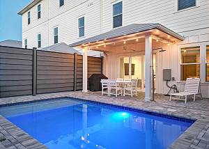 Step into a modern, fully equipped kitchen featuring stainless steel appliances and ample seating, including a dining table for six and four barstools at the marble island. The inviting living room boasts plush seating and an 85-inch TV, perfect for unwinding after a day in the sun. The first-floor master suite offers a king-sized bed, flat-screen TV, and a private bathroom. Outside, a private swimming pool with LED lighting, a water feature, and a dining area creates the ultimate outdoor oasis.