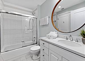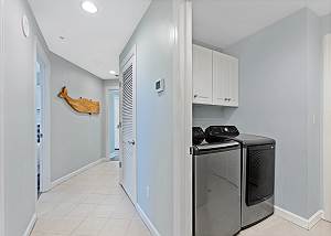 The condo also includes three full bathrooms, a washer and dryer, and sleeps up to 12 guests comfortably with additional sleeping space on the pull-out sofa.
