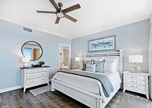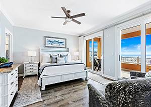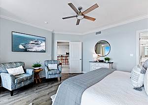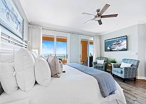 • Master Suite 1: King bed, private bathroom, TV, and balcony access with Gulf views.