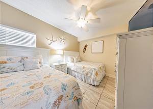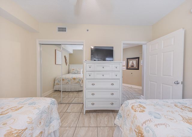 The 3rd bedroom has 2 queen beds and a large flat screen tv.