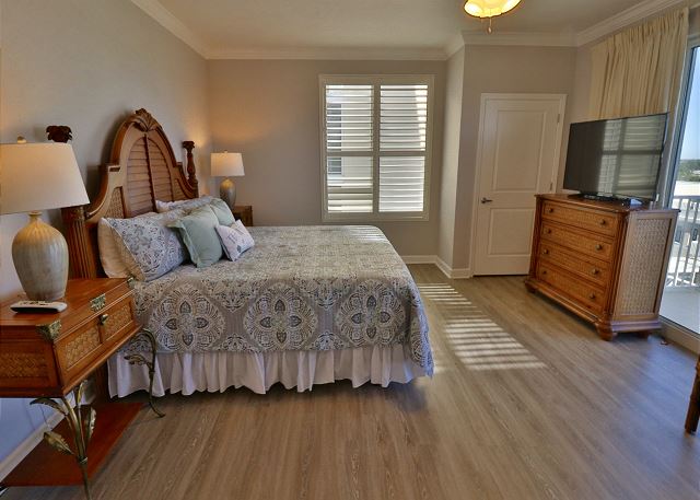 The MASTER SUITE features luxurious KING bed and private bath. There’s plenty of space to store your beachwear in the spacious closets. You’ll notice the large 40” flat screen TV that makes for great viewing when you’re relaxing after an activity filled day in Panama City Beach. You can step out onto the balcony from the MASTER SUITE which is really nice.