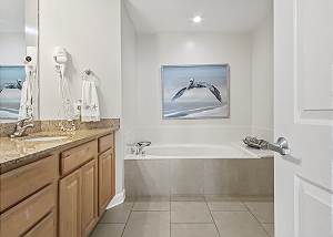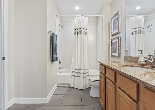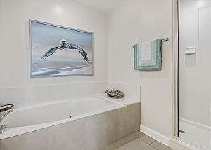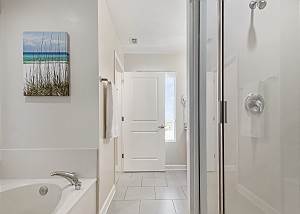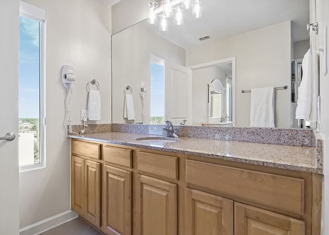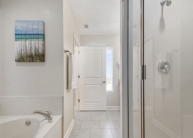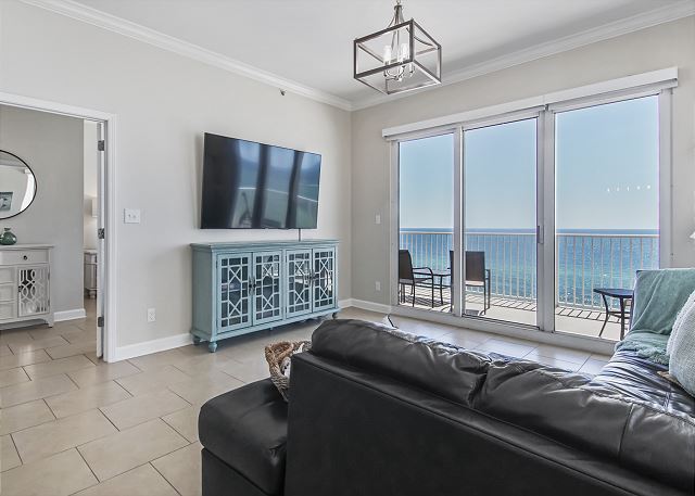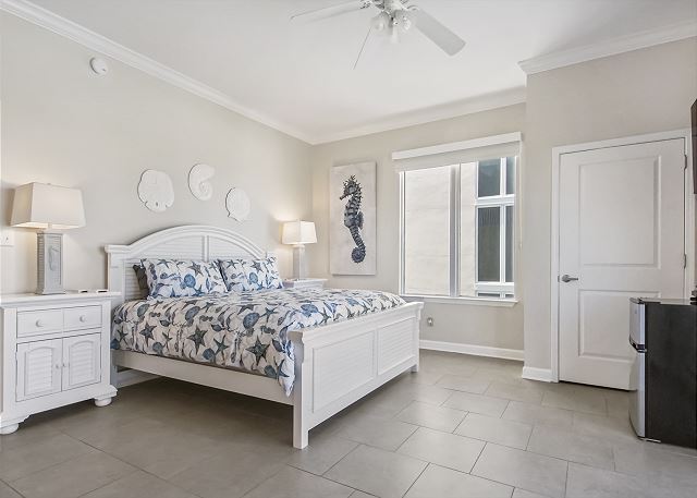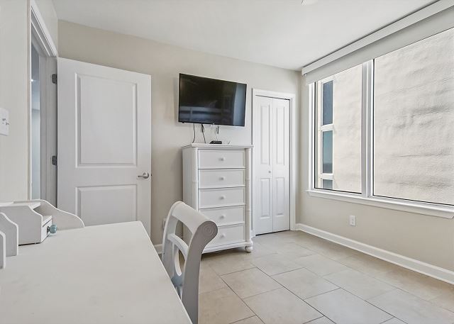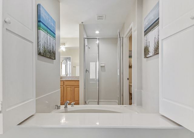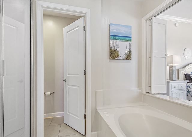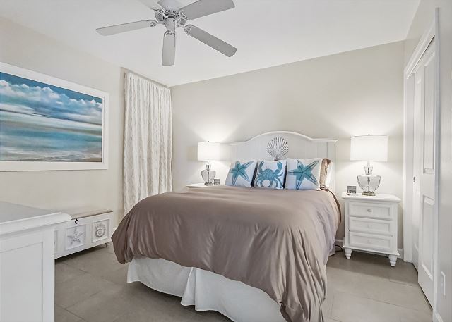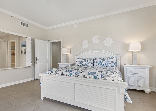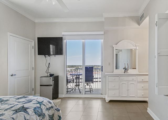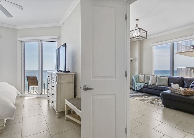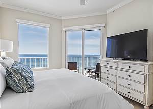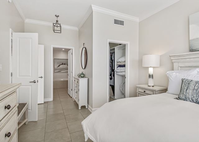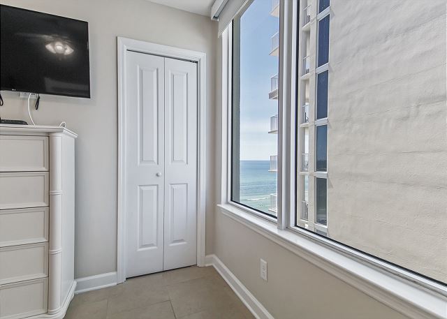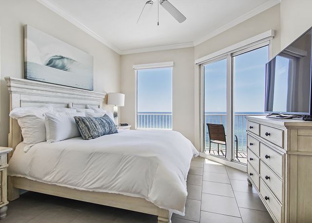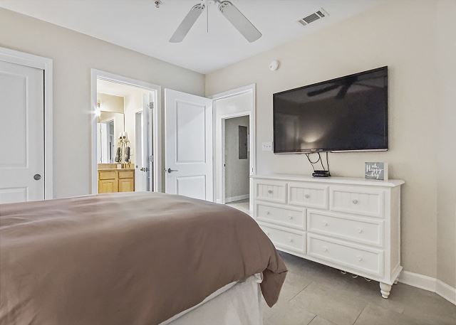 The MASTER SUITE features luxurious KING bed and private bath. There’s plenty of space to store your beachwear in the spacious closets. You’ll notice the large 50” TV that makes for great viewing when you’re relaxing after an activity filled day in Panama City Beach. You can step out onto the balcony from the MASTER SUITE which is really nice.