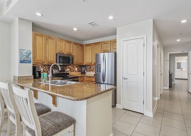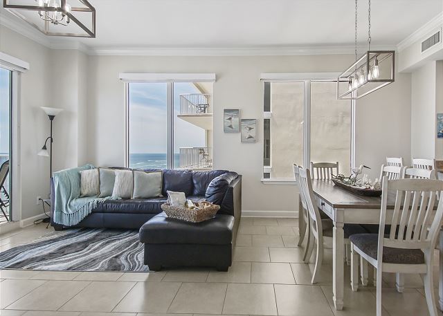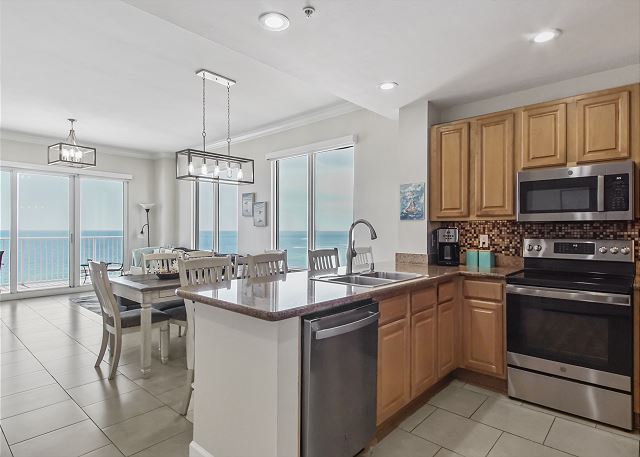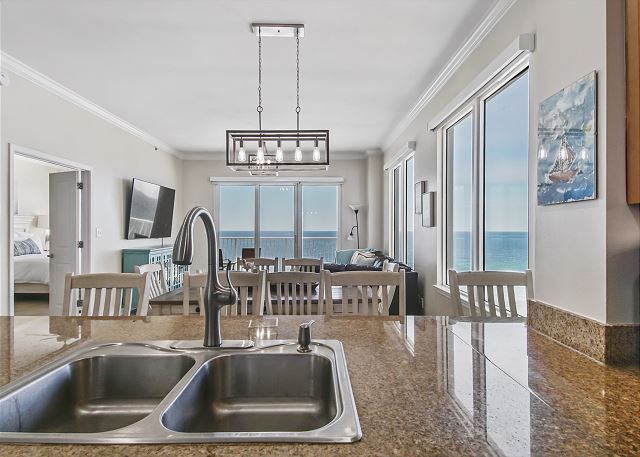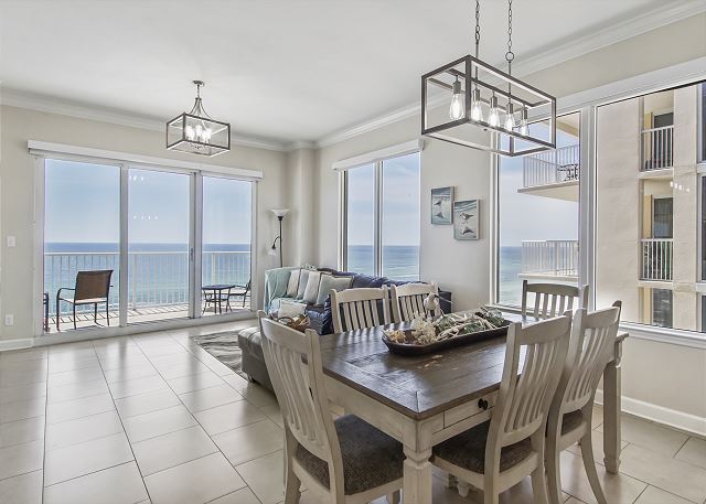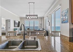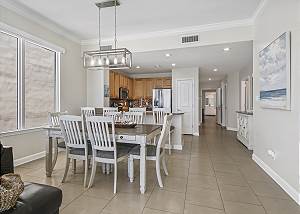 The DINING AREA comfortably seats 6 plus 3 at the breakfast bar and offers beach views so the family can share meals and trade their favorite part of their days at the beach while enjoying all the beauty of the gulf.