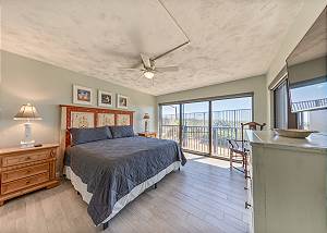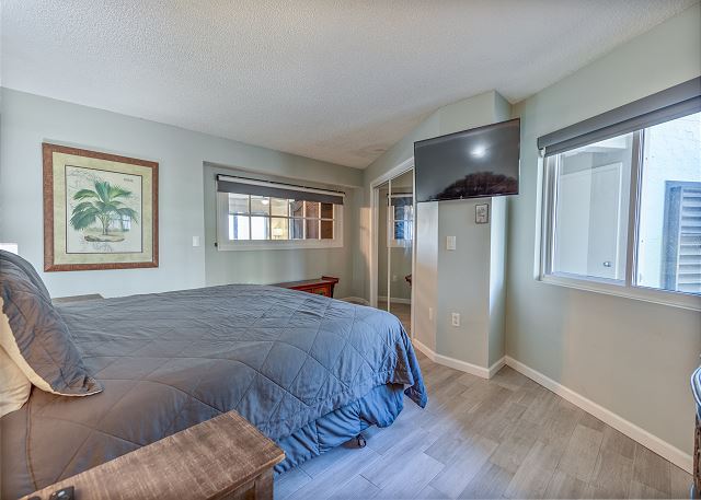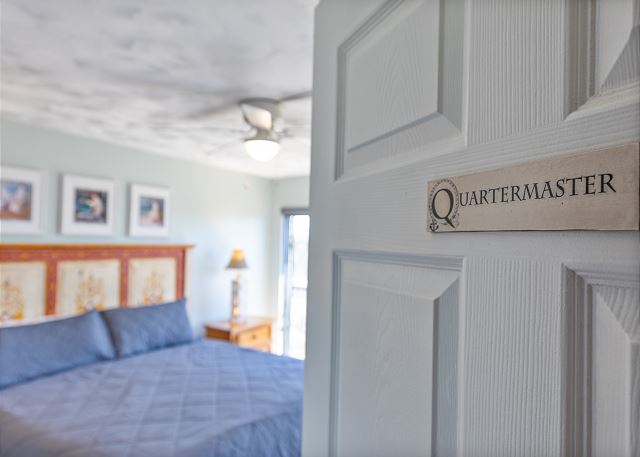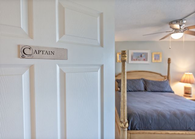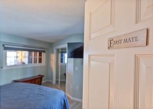 • First Mate’s Cabin – King bed, beach view through nautical windows