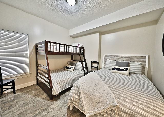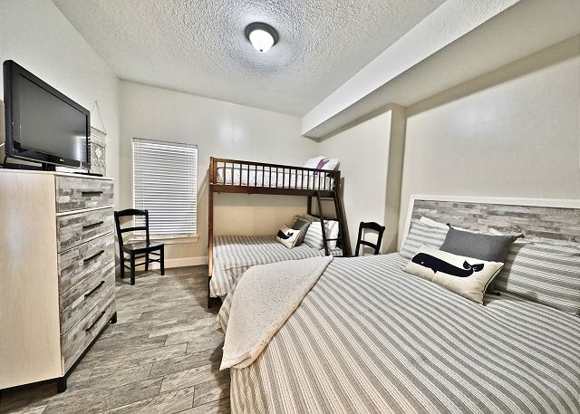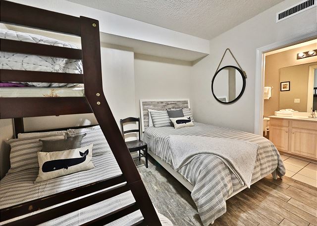 The two master bedrooms with a water view have king size beds in them. The 3rd bedroom has a king size bed and the 4th bedroom has a queen size bed, and a bunkbed that the top is a twin bed and the bottom a double!