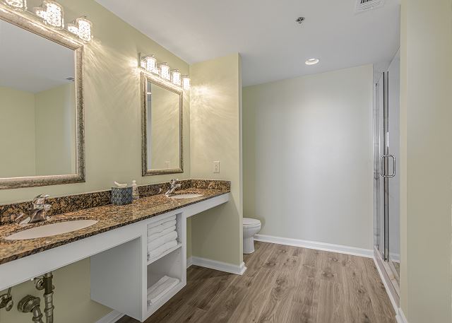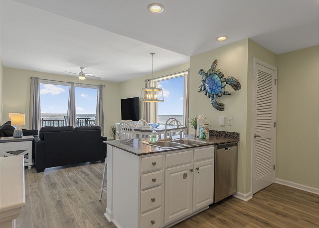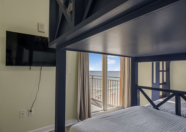 LOW 3rd FLOOR END UNIT Sleeps 10 2 or 3 families can enjoy the very unusual floor plan of this 3 bedroom 3 bath condo. There is a separate private Master Suite that adjoins the rest of the condo with a King Bed, Kitchenette full bathroom tub/shower and private ocean front balcony. The main part of the condo has another Master Suite and private En-suite bathroom. The 3rd bedroom has a set of very sturdy queen size bunk beds. Great room has a queen sofa sleeper. All bedrooms & great room have balcony access with straight out ocean front view