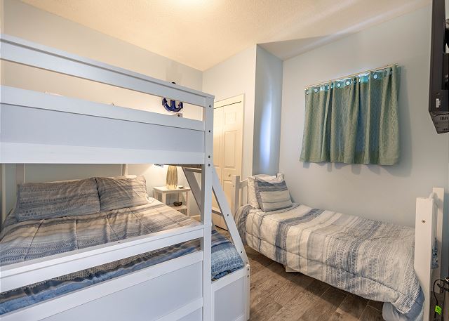 In the secondary bedroom there is a twin size bed and also a bunk bed with a twin over full and a flat screen TV.