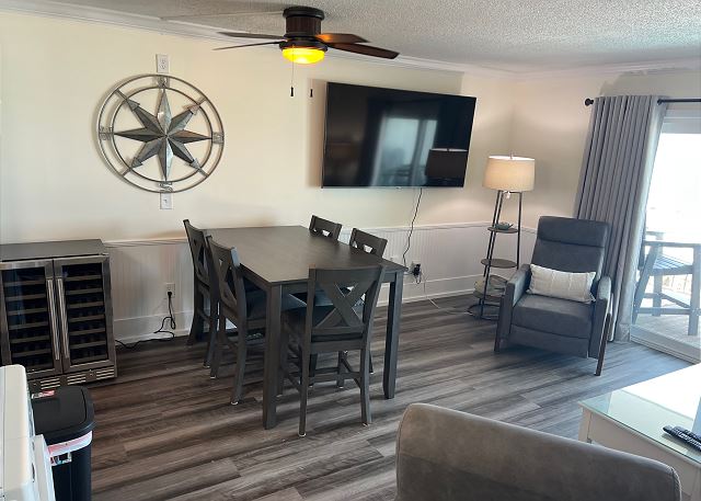 Remodeled; larger kitchen new cabinets, granite counter tops undermount sink, new subway tile backsplash, dual zone beverage / wine cooler. New LPV waterproof vinyl laminate flooring throughout, all new furniture Queen Sofa Sleeper, 2 Recliners, Coffee & End Tables, Bar height Dining Room Table & Chairs with 70" TV new ADA 18" raised height toilets. Entire unit professionally repainted.