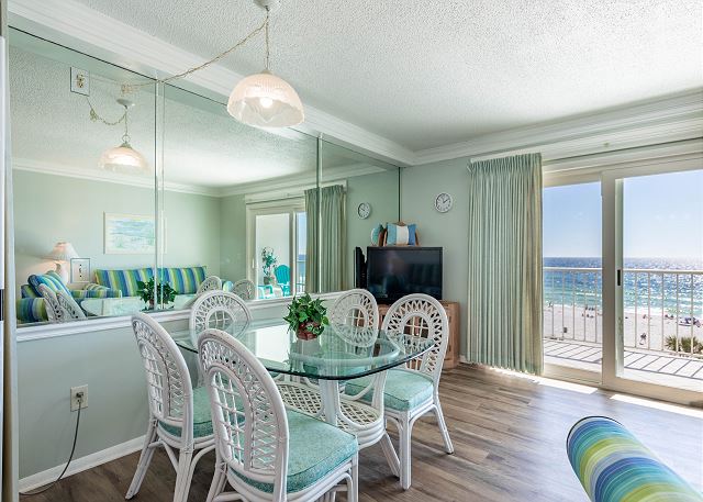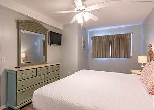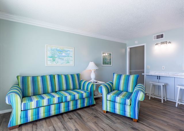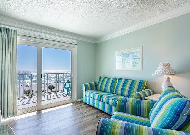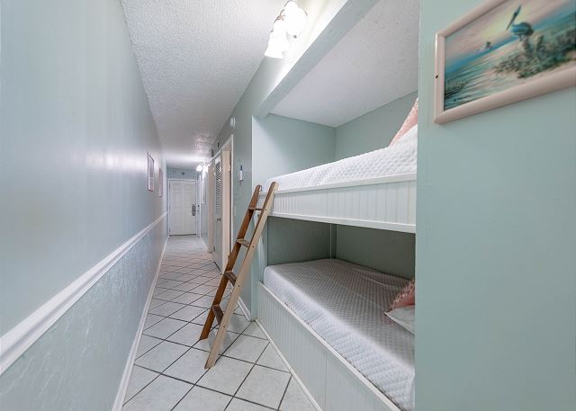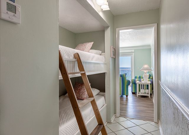 These condos have three separate sleeping areas, Master Bedroom, Bunk Room Area with a door to the living room area, and the living area where the pull out couch is located. The view is absolutely breathtaking. There is a king bed in the Master, a queen sofa sleeper in the living room and twin size bunk beds in the hall bunk room area. The unit sleeps 6 people very comfortably.