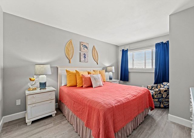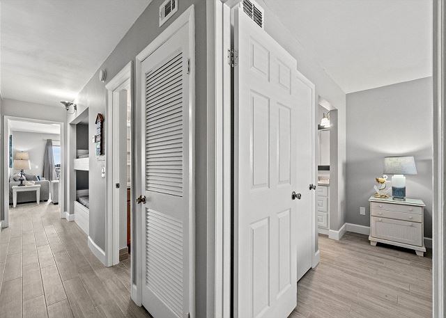 These condos have three separate sleeping areas, Master Bedroom, Bunk Room Area with a door to the living room area, and the living area where the pull out couch is located. The view is absolutely breathtaking. There is a king bed in the Master, a queen sofa sleeper in the living room and twin size bunk beds in the hall bunk room area. The unit sleeps 5 people very comfortably.