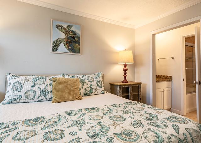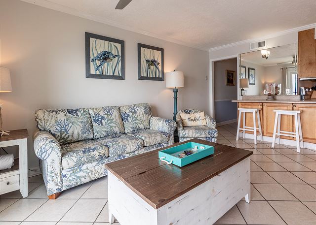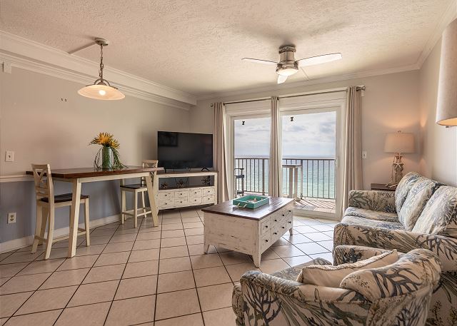 These condos have three separate sleeping areas, Master Bedroom, Bunk Room Area with a door to the living room area, and the living area where the pull out couch is located. The view is absolutely breathtaking. There is a king bed in the Master, a queen sofa sleeper in the living room and twin size bunk beds in the hall bunk room area. The unit sleeps 6 people very comfortably.