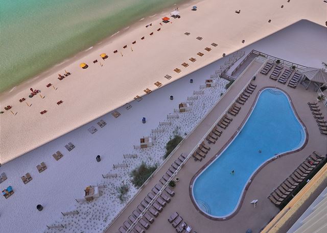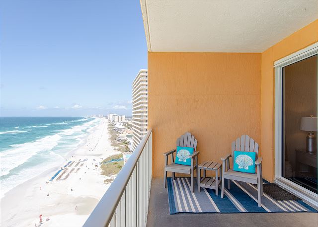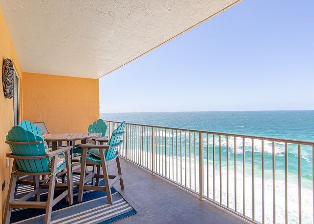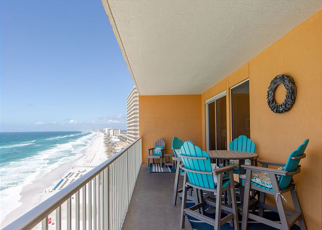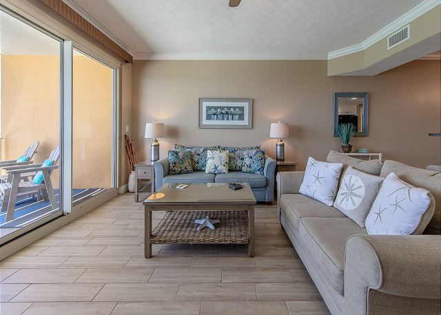 This beautiful condo sleeps 8 and features a large 29’ long balcony overlooking the pool and beach.