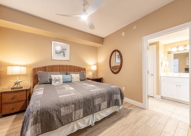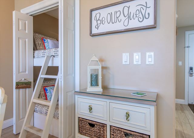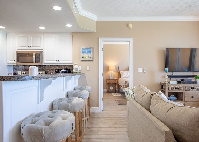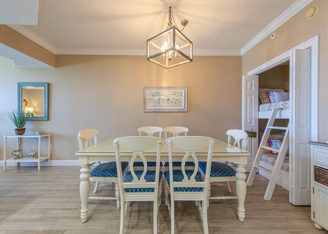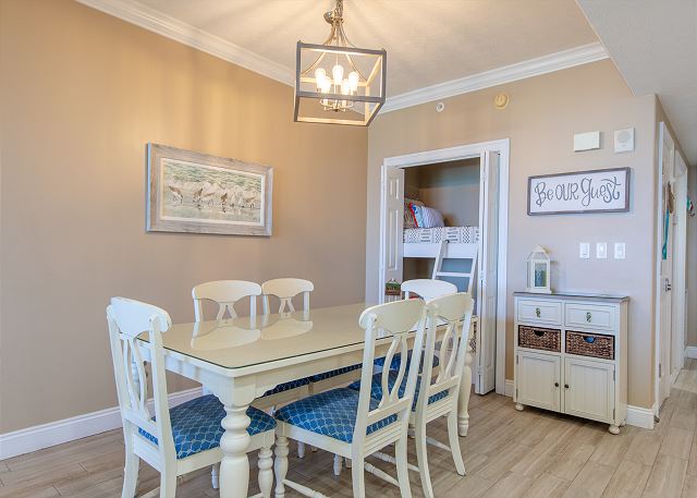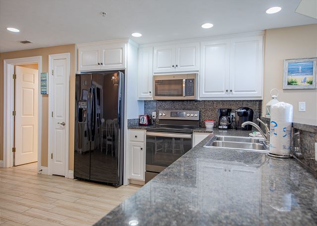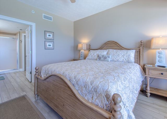 King sized beds in both bedrooms. Additional sleeping available on twin bunk beds and the sleeper sofa. See the water as you wake up and enjoy the beautiful sunsets each night! Visitors will enjoy clean and luxurious furnishings and upscale beach decor. The kitchen is fully stocked with plenty of dishes, utensils, Keurig coffee maker, cooking gadgets, cookware and serving dishes. Linens and towels provided.