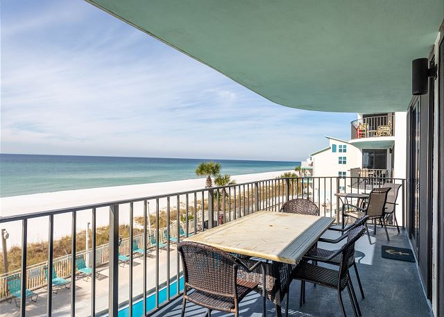 Exterior [38]BEACHFRONT condo on the 3rd floor. PERFECT FOR FAMILIES. With 3 bedrooms and 3 bathrooms. This spacious unit will comfortably sleep 8 in beds plus 2 on sleeper sofa for a total of 10. The beach and beachside pool are just steps away from your balcony.