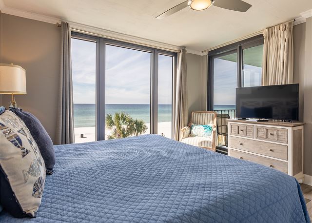 We have two gulf front master bedrooms with en-suite bathrooms. Both have king beds and both have balcony access.