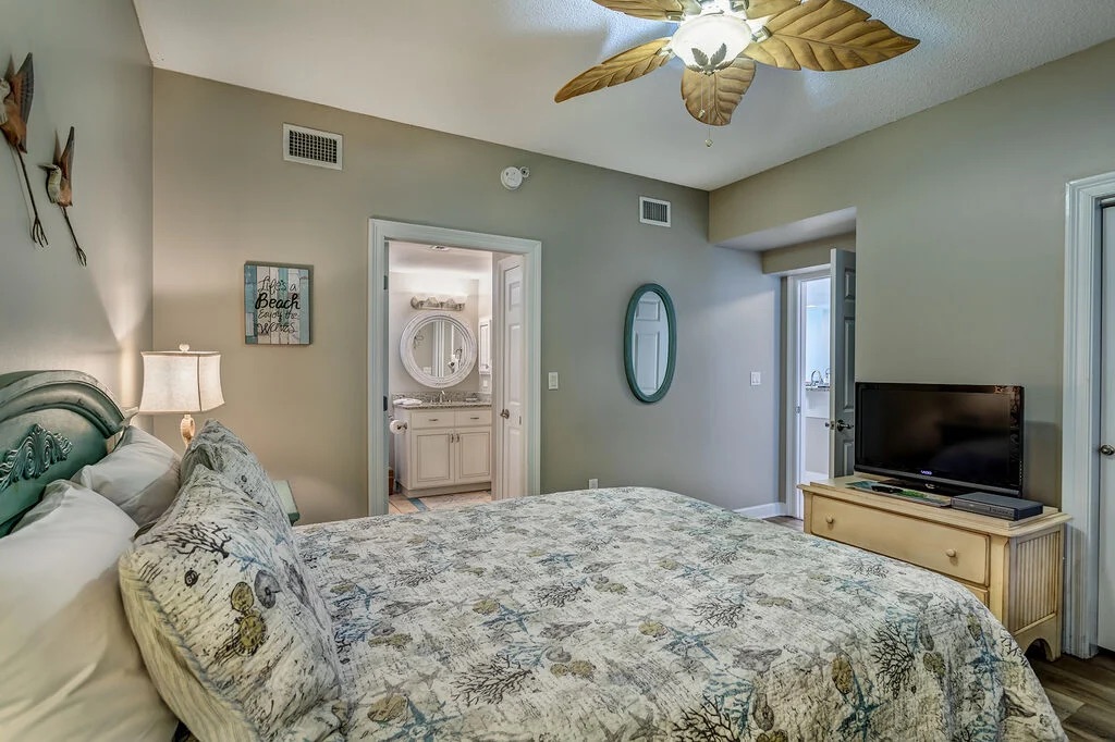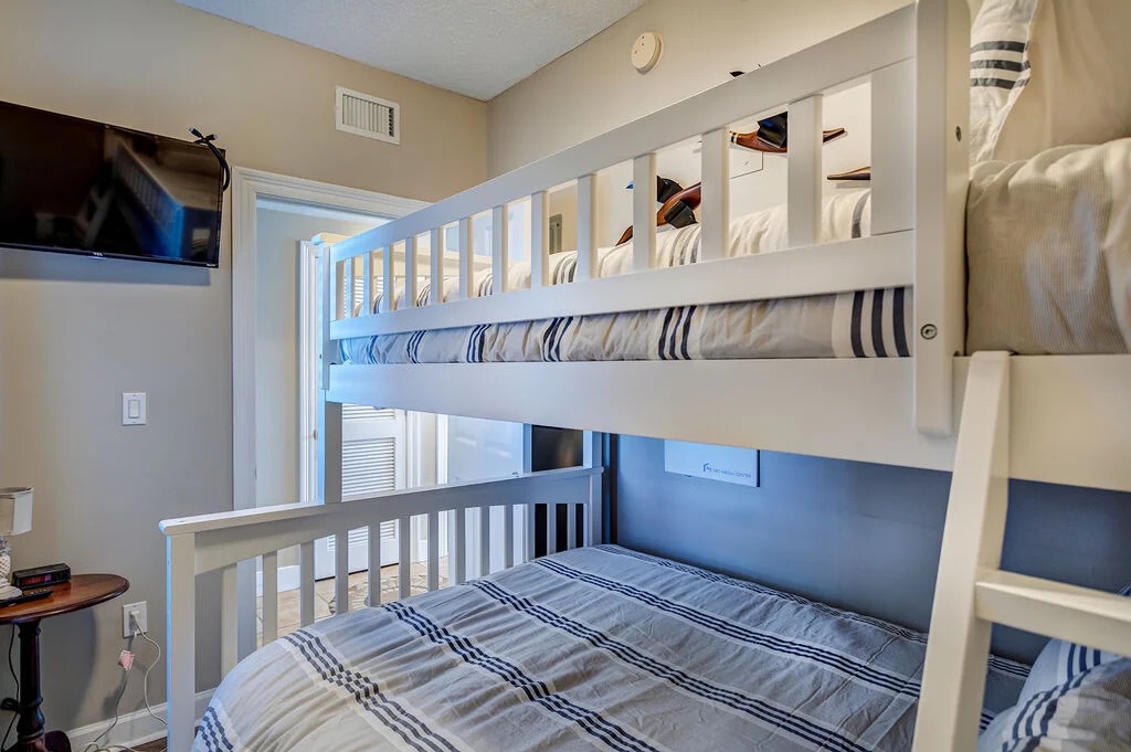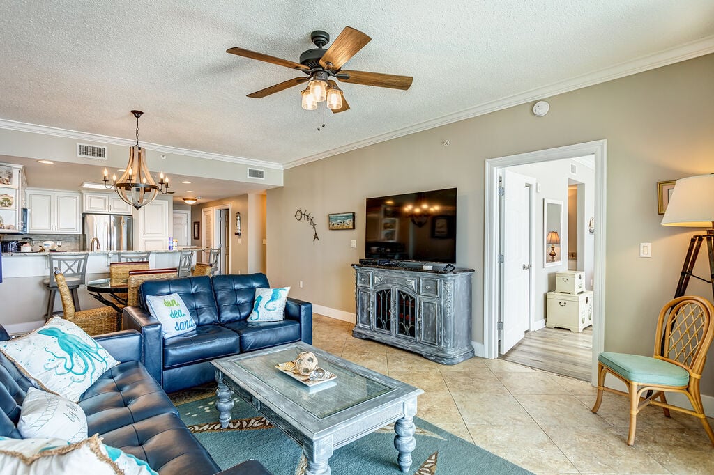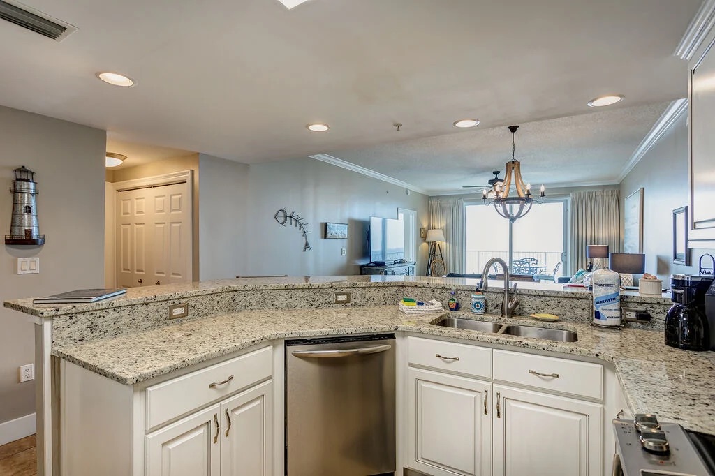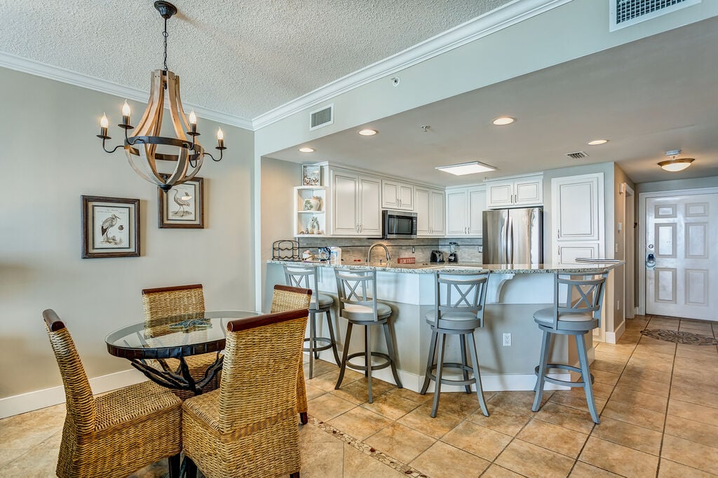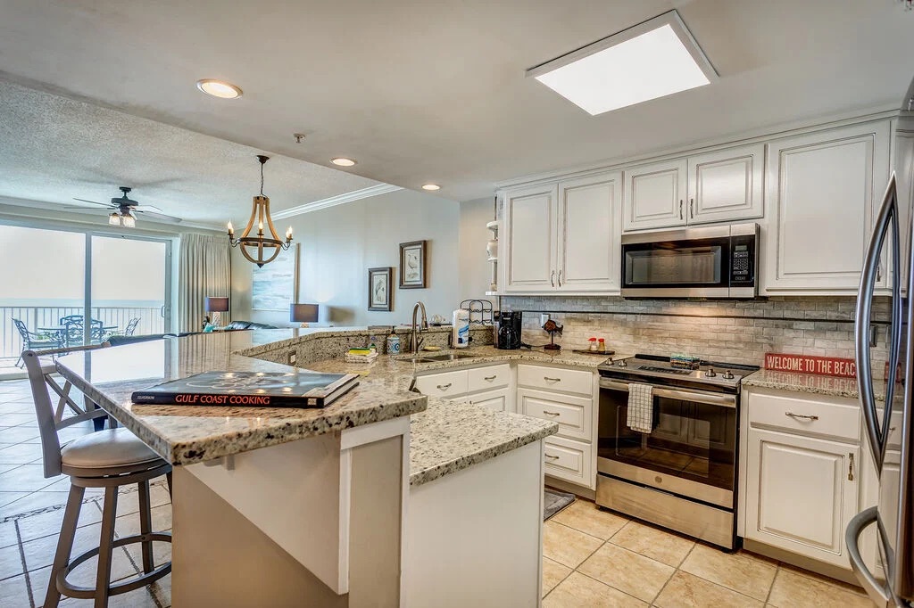The open layout is perfect for a beach getaway featuring gulf views in the living/dining room, master bedroom and breathtaking views on the private balcony. The gulf front master bedroom has plenty of space even with the KING size bed. Enjoy the convenience and solitude of an attached private bathroom with a walk in shower, separate large tub and walk in closet! The 2nd bedroom offers a QUEEN size bed, closet for storage and access to the 2nd bathroom. The 3rd bedroom has a TWIN OVER FULL bunkbed. All 3 bedrooms and the living room are equipped with flat screen TV's. For the common space you have an open living/dining and kitchen. The living room has a sleeper sofa. The kitchen is fully stocked with stainless steel appliances and everything you need to cook during your stay. The dining area has a dining table and bar seating for extra space. This condo does have a full size washer and dryer.